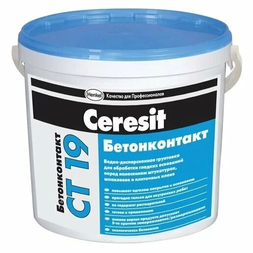 Грунтовка Бетонконтакт Церезит CT 19 ЗимаБетонконтакт марки Церезит состоит из водной дисперсии сополимеров акрилатов с добавлением минеральных наполнителей и пигментов. Грунтовкой обрабатывают гладкие основания с низкой способностью впитывать влагу: монолитный или сборный железобетон. Обработка при помощи грунтовки проводится перед последующим нанесением плиточного клея или штукатурки. Допускается замораживание до 5 циклов.Преимущества:состав готов к применению;полностью высыхает через 3 часа после нанесения;легкое нанесение;обеспечивает высокую адгезию последующих материалов к бетонному основанию;для наружных и внутренних работ;делает гладкие поверхности шероховатыми;экологически безопасна.Упаковка и хранениеАдгезионная грунтовка реализуется в пластиковом ведре весом 15 кг. Хранить продукцию надлежит в сухом месте не нарушая герметичность упаковке при температуре от +5 С. Гарантийный срок хранения составляет 12 месяцев.