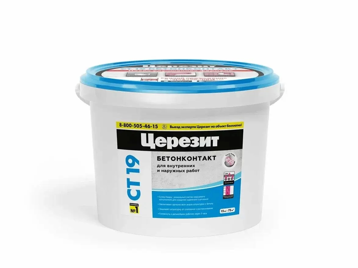 Грунтовка СТ 19 производства ЦерезитПри помощи грунтовки «Бетонконтакт» выполняют обработку гладких вертикальных оснований из бетона перед тем как наносить штукатурки, краски, шпаклевки и плиточные клеи. Грунтовка предназначена только для внутренних работ и имеет в своем составе кварцевый песок, благодаря которому обеспечивается высокое сцепление отделочных материалов с основанием.Церезит СТ 19 наносится кистью на сухие и чистые поверхности. Проводить работы рекомендуется в сухих условиях при положительных температурах.Преимущества:продукт готов к применению;влагостойкая;выполнена из экологически безопасного материала;паропроницаемая;не содержит растворителей в составе.Упаковка и хранениеГрунтовка Церезит«Бетонконтакт» реализуется в полимерных ведрах весом 5 кг. Хранить продукцию следует в герметичной таре вдали от солнечных лучей и приборов отопления. Складское помещение должно быть оборудовано надлежащей вентиляцией.