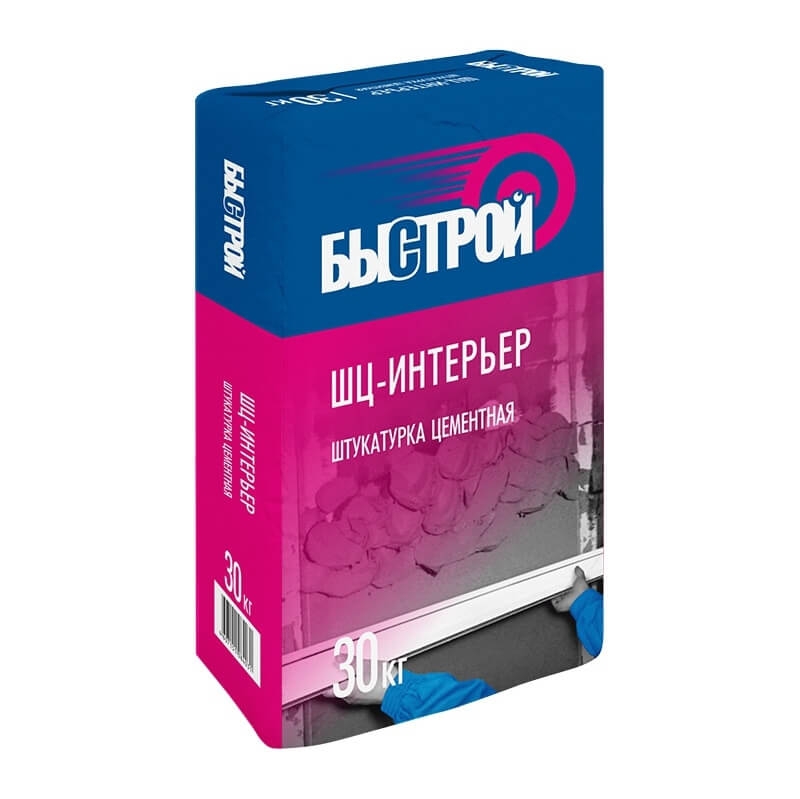 Смесь сухая штукатурная цементная БЫСТРОЙ ШЦ-интерьер 30 кгСухая смесь БЫСТРОЙ ШЦ-интерьер предназначена для приготовления строительного раствора, используемого при температуре воздуха более 5оС для оштукатуривания стен внутри помещения. Пригодна для помещений с повышенной влажностью – кухни, ванные комнаты, подвали и т.д. Применяется вручную или при помощи любых штукатурных механизмов. Можно производить смешивание с помощью электродрели с миксерной насадкой или смесителем непрерывного циклического действия.Расход воды на 1 кг смеси: 0,20-0,24 л.Преимущества:толщина слоя: 5-25 мм;для внутренних работ;жизнеспособность раствора 3 часа;прочность.Упаковка и хранениеСухая смесь БЫСТРОЙ ШЦ-интерьер поставляется в мешках по 30 кг. Хранить мешки надлежит на деревянных поддонах в помещениях с сухим микроклиматом.